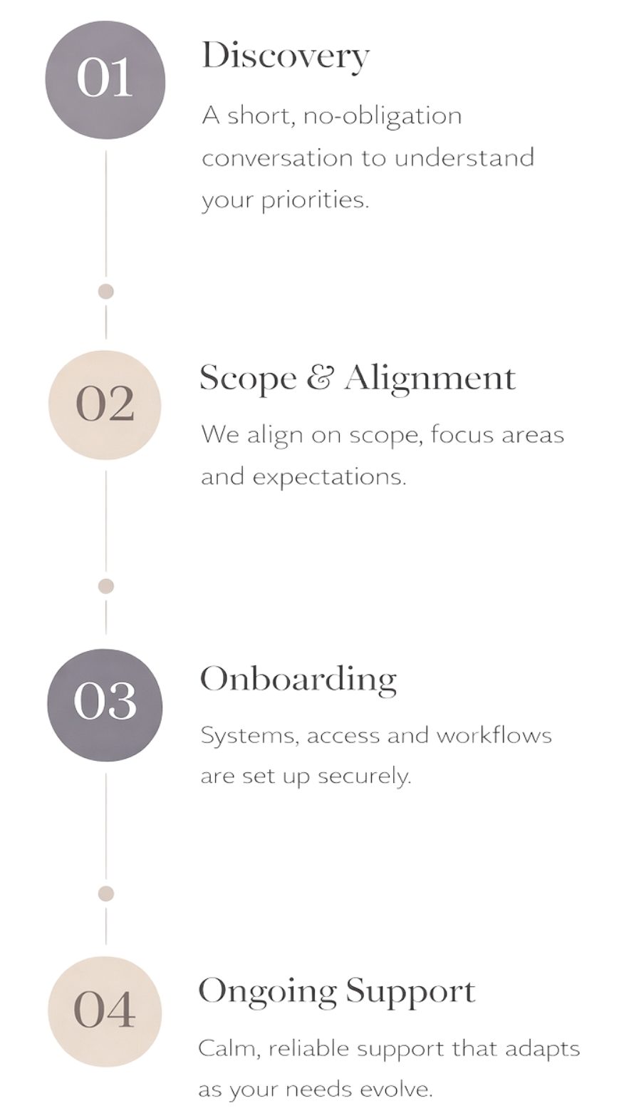 Our support packages are designed to provide calm, structured assistance that adapts to how you work – from essential organisation to strategic, ongoing support.